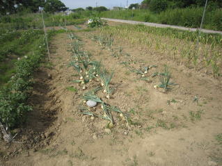 収穫間近かのタマネギ。ほとんど倒れました。2020.06.14 8:26 左タマネギお試し収穫。2020.07.19 10:53