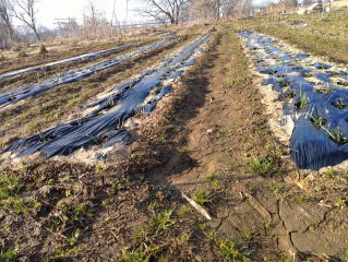 | タマネギはホームセンターで苗として売っているようですがコスト高。おらホでは秋に種を蒔いて苗を作り、定植します。収穫は翌年6月頃です。 種まき 蒔き時 例年9月1日前後にしている。人によってはポットに種を蒔き適当な大きさ(つまようじくらいの太さ、大きさ)になってから移植するが、おらホでは家庭菜園内で苗を作ってきた。 割り箸くらいの太さになってから定植している。 蒔き方 @良く耕した地面に高さ15センチ、幅45センチほどの床を作ります。 Aこの床に深さ3センチほどの溝を3本切ります。 Bここに1粒づつ種を筋蒔き風に置いていきます。この時まだ土を上掛けしません。 C買い求めた種の残り具合を確かめ、残っていたら適当に蒔き、足りないようだっらB種を拾い集め適宜蒔いていきます。 D土をかけてからその上に籾殻を籾殻を蒔きます。 ポイント 出来るだけ均等に薄く蒔き、間引きしないように心がけています。 手入れ 肥料 芽が出たら顆粒状肥料、尿素を蒔いています。ネギ類は肥料を与えた分だけ大きくなるようです。 雑草取り 雑草取りはマメにしなければなりません。 定植 準備作業 @良く耕した地面に尿素、油かすなど均等に降り、更に良く耕し数日間放置しておきます。 Aマルチ(黒いビニール)を敷き、固定します。これをまた、数日間程度放置しておきます。 定植 @穴開け器しい1畝3列、15〜20センチ間隔となるようにとなるように穴を開けていきます。 A1本ずつ苗を植えていきます。 定植後の手入れ 肥料 ネギ類は肥料を好むとありましたので、顆粒状肥料、尿素を2回ほど投入しています。おらホでいうサクヅカゲです。 収穫 例年6月中下旬頃でしょうか。適当な大きさのものから適宜収穫していきます。 |