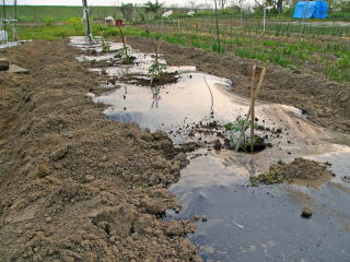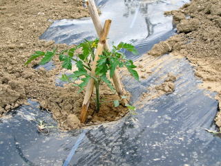 よく耕した地面に幅3〜4尺のマルチ(黒い農業用ビニール)を敷き、固定します。マルチの敷き方にはコツがありますが、おらホでは風のない早朝にしています。