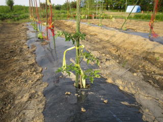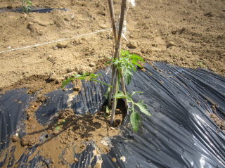| 1本65円のトマト苗を2本購入しました。定植後、水をかけた状態です。余りにも小さいので、葦棒支柱立てをしていません。2018.04.29 13:04 | トマト苗、伸びが早いです。芽欠き作業も終えました。2018.05.21 17:44 | ||||||||||||||||||||||||||