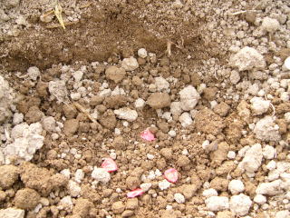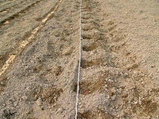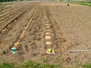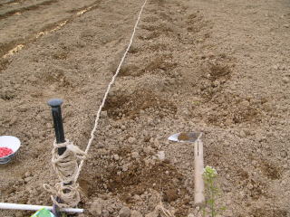@良く耕した地面に移植べらで約30〜45センチ間隔で、直径約6センチメートル、深さ3〜4センチメートルの穴を掘ります。