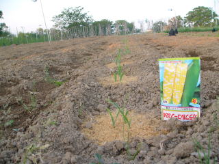 トウモロコシの2回目の本格的土寄せです。肥料を与えました。
