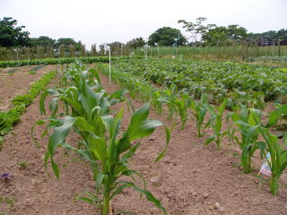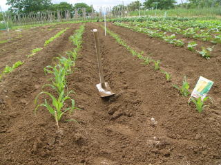 トウモロコシ、2本達に間引きしての土寄せです。収穫は1本の苗から1、2本です。 2009.05.23 11:05 撮影
