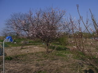 右、小梅6部咲き。左、豊後梅、ほぼ満開。蜂が飛んでいるので