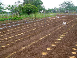 適度な雨。ありがたいことです。中上まで風車式モグラ 撃退機が見えますが、ちなみにここまでがおらホの家庭 菜園です。 2009.05.17 7:05 撮影
