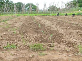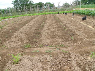 昨日夕方に定植したキャベツ、ブロッコリー、天気予報通りの雨で定植成功を確認した。これから、このか弱い苗を一人前にしていかなければならない。8,9月頃までには収穫できるうようにしたい。