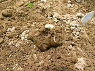 掘り返した生姜の固まり。白い芽と根っ子のようなものを 確認できます。すぐ埋め戻ししました。 2009.06.14 11:10 撮影