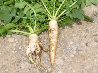 今日のお試し収穫、夏大根、右側長さ30センチメートルです。 2009.06.14 12:50 撮影