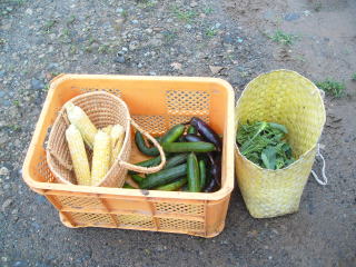 今日の収穫野菜。右かごの中はブロッコリーです。