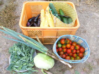 おらホの取りたて夏野菜。コンテナ内、左からナス、トウモロコシ、