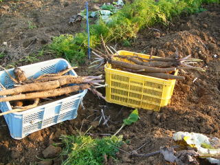 おらホの家庭菜園でいちばん辛い作業といえばゴボウ収穫。というのも河川敷であるが長年掘り起こしがなかったので深さ50センチくらいまでは粘土質のように固いからだ。ゴボウ掘りすると自ずと1メートルくらいは掘り起こしするので、土壌改良と思ってゴボウを植えつけ掘り返している。ゴボウ自体は勝手気ままに根を張っていくのか正に「天然」。コクのあるものとなっている。