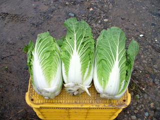 お隣の畑の白菜は牛の頭ほどの大きさなのに、これに比べておらホの白菜はヤギの頭といったところ。でも、指で押してみると結構固くなっている。