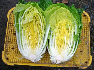 ゴボウの収穫を決め込んでいた今日土曜日はあいにくの冷たい雨。かといってジッとしていられない。ならばと、気結球が遅れてがかりだっ白菜のお試し収穫をした。