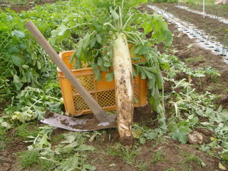 タクアン用白首大根。下の部分が葉っぱの部分です。 2009.11.29 12:03 撮影