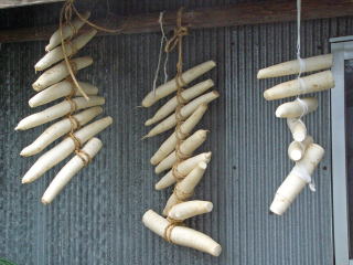 おらホではタクアン漬け用の白首大根とし、吊し干して漬け込みしている。昔は各家庭で見られた光景であるがおらホの町内会ではおらホだけになってしまった。この吊し干し、20年ほどつづけている。吊し干しすることで長期保存が利き、来年5月始め頃まで風味が保たれる。当然保存剤などは使わない。