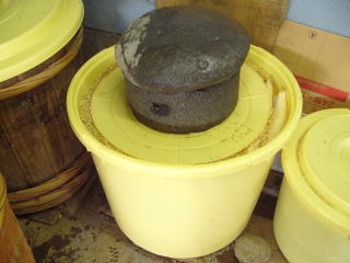 大樽に並べるように置いて「玄米漬けの素」を蒔くように入れま