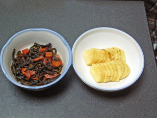 左は「ささぎ水戻し煮」です。ニンジンを含めて写真の食材は