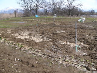 ポカポカとした陽気に誘われて我慢しきれずに下見を兼ねてサヤエンドウの種まき、ニラの枯れ枝除去をした。