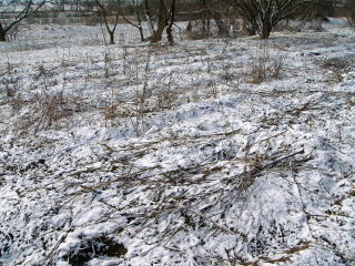 さらっと積もった雪の中に昨年不始末した枯れた豆と雑草を