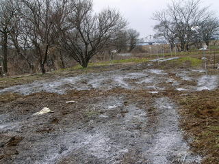 枯れ草を取り石灰を蒔きました。白っぽく見えるのが石灰です。