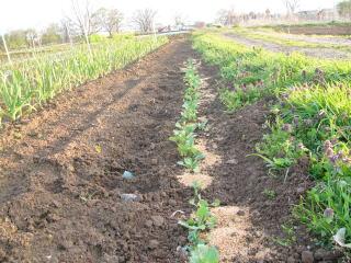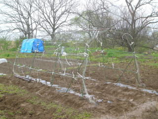 左から2列サヤエンドウ、中1列ナガイモ、右がツル有りササギ