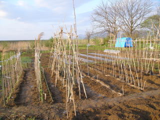 キュウリ、サヤエンドウ、ナガイモの支柱立てをした。主な材料は周りに自生している葦で無尽蔵にある。