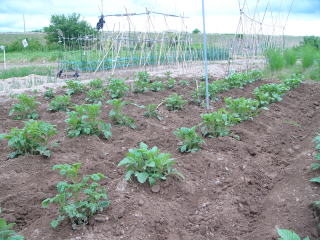 肌寒い曇りの日もようやく一服。今日日曜日は日も差して初夏らしい一日となった。雑草を取り鶏糞を蒔いて土寄せをした。これで野菜達も