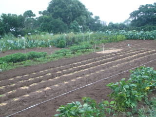 白菜の周りににもみ殻を敷き、水をかけました。黄色い斑点に 見えるところが白菜を定植した所。全部で130個ほどになりました。 2010.09.01 5:58 撮影