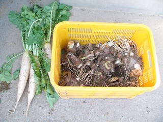 コンテナの中は里芋です。2株ほどお試し収穫してみました。 もちろん、芋煮汁にしていただきました。 2010.10.23 11:56 撮影