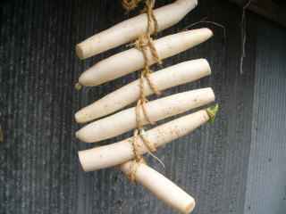 収穫したタクアン大根を吊し干した。生での大根漬けも良いが、日持ちしない。しかし、これが10日ほど干すと日持ちが良くなり、歯触り感