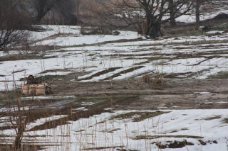 この時期の融雪は早い。畑の雪解けの状況確認のため下見をする。直接現場には行かないで最上川堤防からの下見であるが、タマネギの