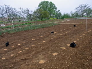 擬似烏、これからが本番です。ささぎ、落花生の若芽は間もな く発芽しますが、野鳩にとって絶好のご馳走です。烏たちは野 鳩達から若芽をガードします。 2011.05.11 5:42 撮影