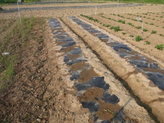 昨年ここはアカザが大発生した所です。マルチの土がぬれて