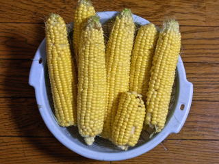 収穫したトウモロコシ。虫食いがありますが、甘み、歯触りは