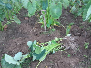 | お裾分けのために里芋収穫。が、少し時期が早いような気がする。 タマネギの来年栽培のためにマルチ張りをした。定植は16日の予定。 山形青菜の間引きをした。 |