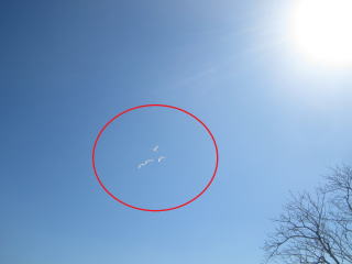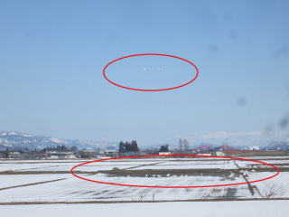 | 田圃には白鳥が羽を休め、空には白鳥が羽ばたく。2023.03.05 9:57 | 間もなく北帰行。小編隊でのトレーニング。2023.03.05 11:13 |