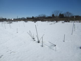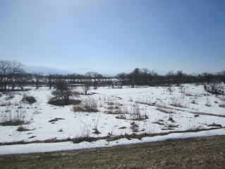 | おらホの家庭菜園、雪原状態。手前堤防が雪がない。2023.03.05 9:46 | 家庭菜園はまだ30センチ程度の雪。2023.03.05 12:51 |