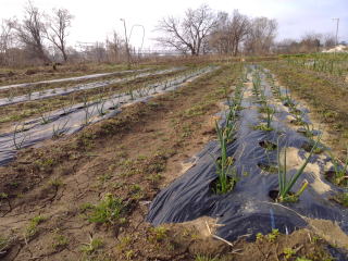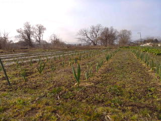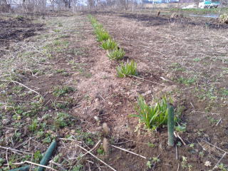 | ニラ、大きくなってきた。間もなく収穫?2026.03.28 8:10 | 雑草取りを待つニンニク。2026.03.28 8:12 |