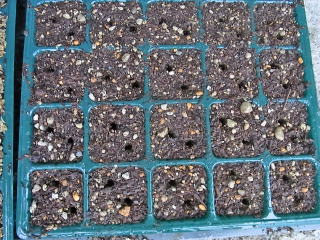 連結ポットに専用土を種まき、水をかけてから割り箸で穴を開け