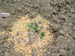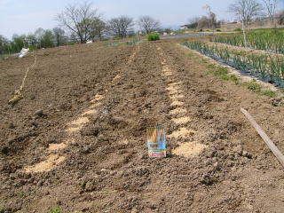 @良く耕した地面に15センチ間隔に直径15センチ、深さ数センチ程度の窪みを掘ります。この時底を出来るだけ平にします。