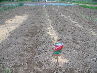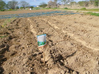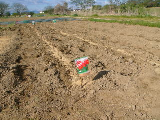 @良く耕した地面に深さ3センチメートル程度に、深さ約3センチの溝をV字状に掘ります。