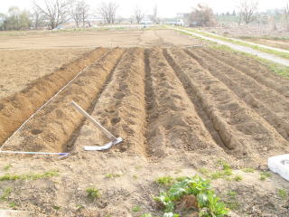 @良く耕した地面に桑で深さ約10〜15pの溝を掘っていきます。この溝はV字なったりU字になったり、幅も均一でなかったりしますが、本来ならば適度なものというのがあるんでしょうが、ナーバスになっていません。