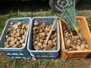 茎が枯れた頃を見計らって発掘します。どこに埋まっているか分かりませんので遠目から桑を入れていきます。収穫は楽しいですが結構重労働です。