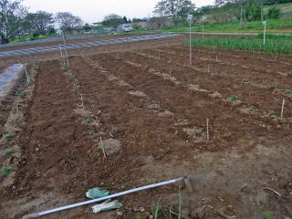 畝幅80センチ、約40〜45センチ間隔で仮起きします。白く