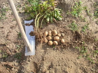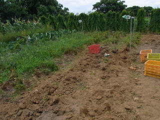 茎が枯れた頃を見計らって発掘します。どこに埋まっているか分かりませんので遠目から桑を入れていきます。収穫は楽しいですが結構重労働です。