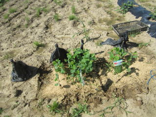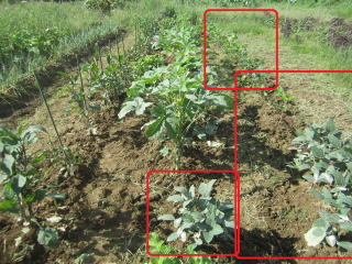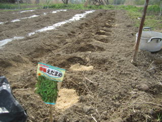 B2本ずつ植え付け、土を欠けます。溝も同時に埋めていきます。