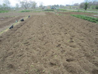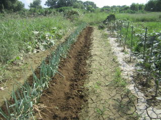 よく耕した地面に深さ20センチくらいの溝を鍬で掘ります。畝幅は作業を考慮し1メートル位でしょうか。
