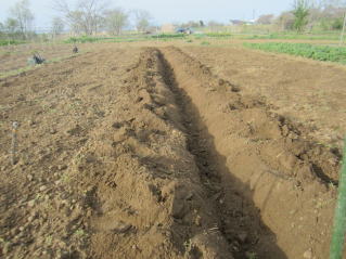 | 鍬で溝を切る。深さ20センチ程度。2022.04.24 6:30 |