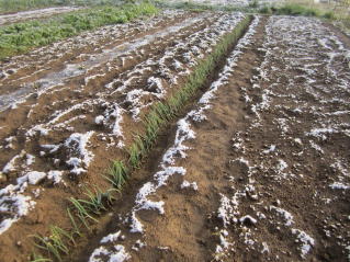 青々としてきたら市販の顆粒状合成肥料をパラパラとかけ周りの土を土を寄せています。(サクヅカゲ)