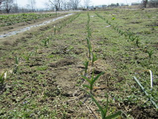 | 雪解け直後のニンニク。雑草を取り追肥していく作業が待っている。2021.03.19 5:53 |